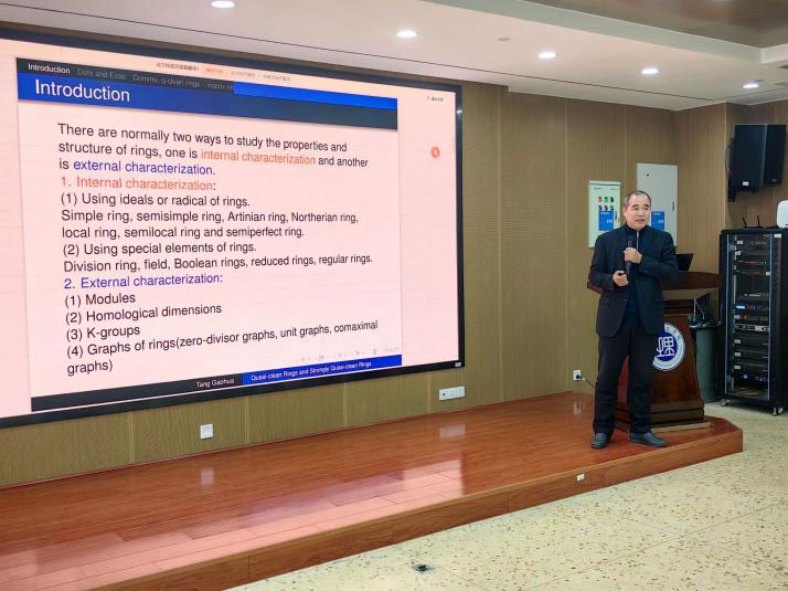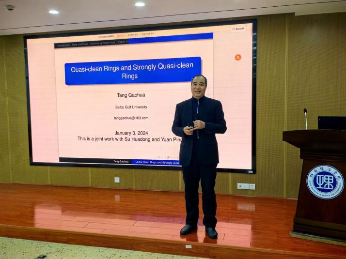 1月3日上午,北部湾大学唐高华教授应邀在17102报告厅为数学学院师生做了题为“Quasi-clean Rings and Strongly Quasi-clean Rings”的“数学大讲堂”专家讲座,数学学院副院长周小强(主持工作),副院长李松华、罗德仁,以及部分教师、全体研究生与会。
