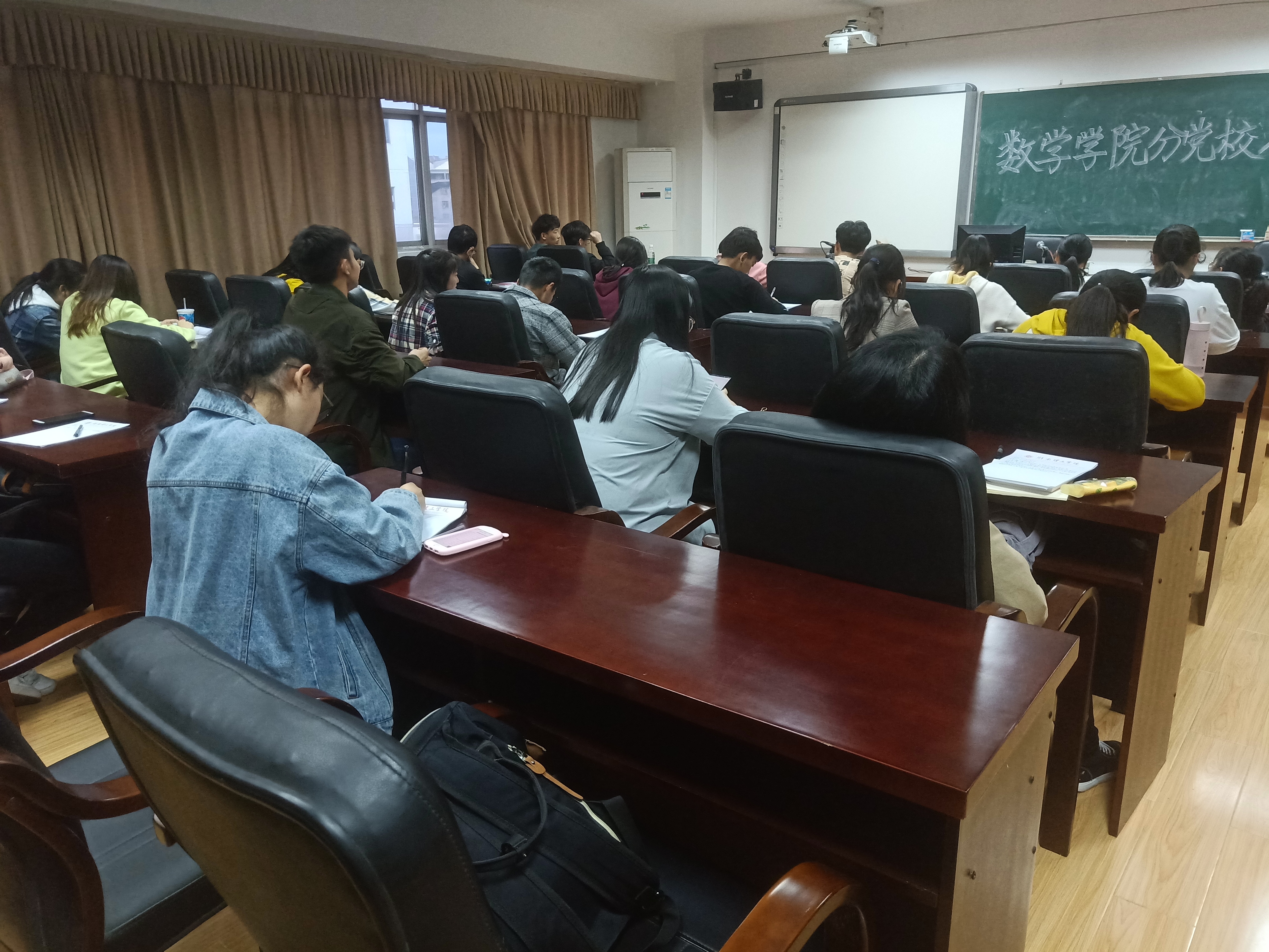 本站讯4月17日晚7点,数学学院在5511教室开展了本学期第三次入党积极分子培训,数学学院教工二支部书记何帆老师就“认真学习党章,严格遵守党章”对我院全体入党积极分子进行培训。