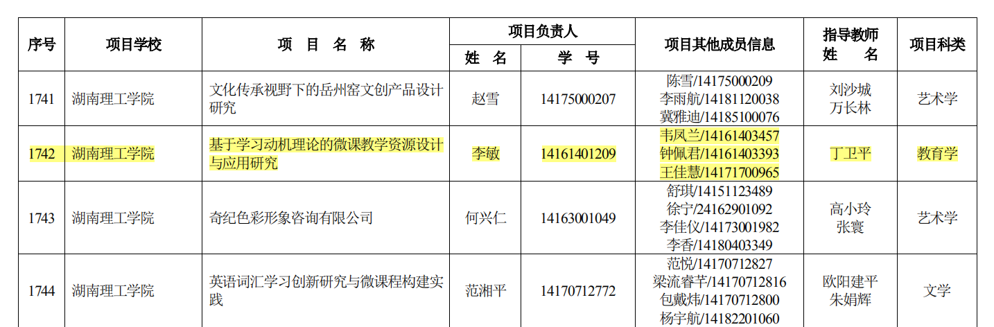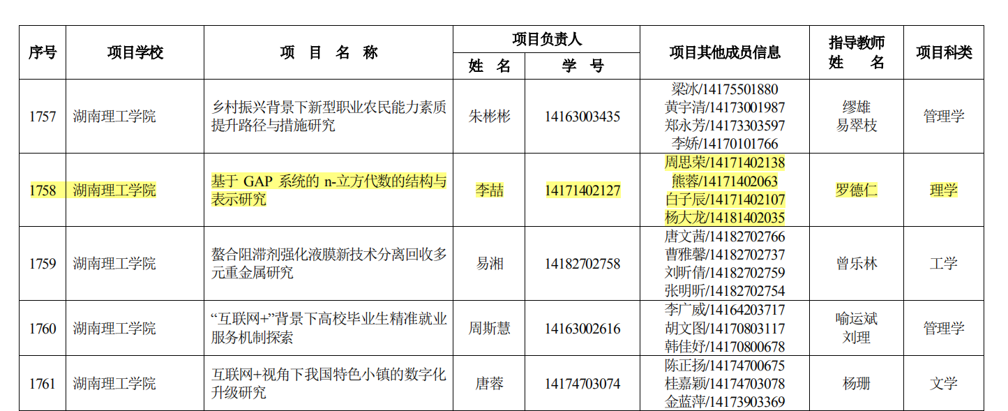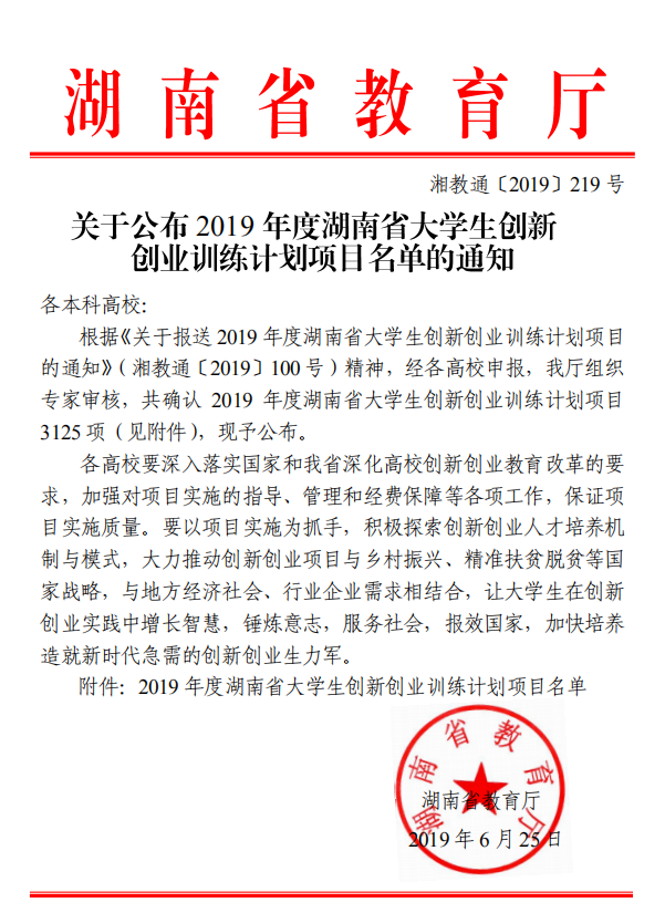 湖南省教育厅6月25日发布“湘教通〔2019〕219号 关于公布2019年度湖南省大学生创新创业训练计划项目名单的通知”,我院数学16-2BS学生李敏同学申报的“基于学习动机理论的微课教学资源设计与应用研究”(项目指导老师丁卫平)和数学17-1BS学生李喆同学申报的“基于 GAP 系统的 n -立方代数的结构与表示研究”(项目指导老师罗德仁)获得立项。