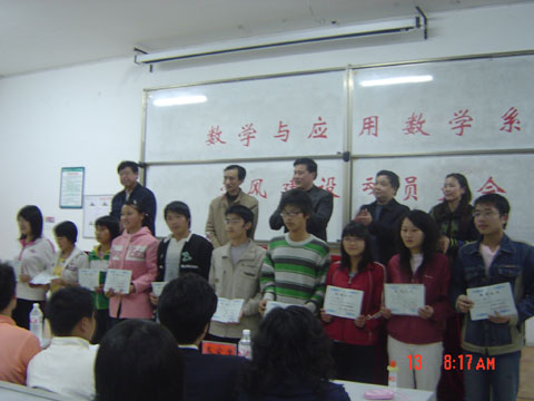 据悉,本次大会是由数学系党总支书记甘向阳老师主持。大会共分为8个议程,会上首先由数学系党总支副书记李丽荣老师作学风建设动员报告,报告中主要对本系各个班级的学风现状作了全面的概括和分析,接着数学系副主任周立仁老师宣读了2007年度先进班级、先进个人的获奖名单,并进行了隆重的颁奖仪式,数学系优秀学风班级班主任彭定忠老师和学风建设优秀个人杨阳同学分别就自己的先进事迹进行了发言,新一届学生会主席杨靖同学宣读了《加强我系学风建设提倡书》,接着数学系主任孙明保老师对本次会议作了简要的概括和总结,最后学工部部长柳周峰老师发表了指导性讲话,并对数学系学风建设给与了充分的肯定。