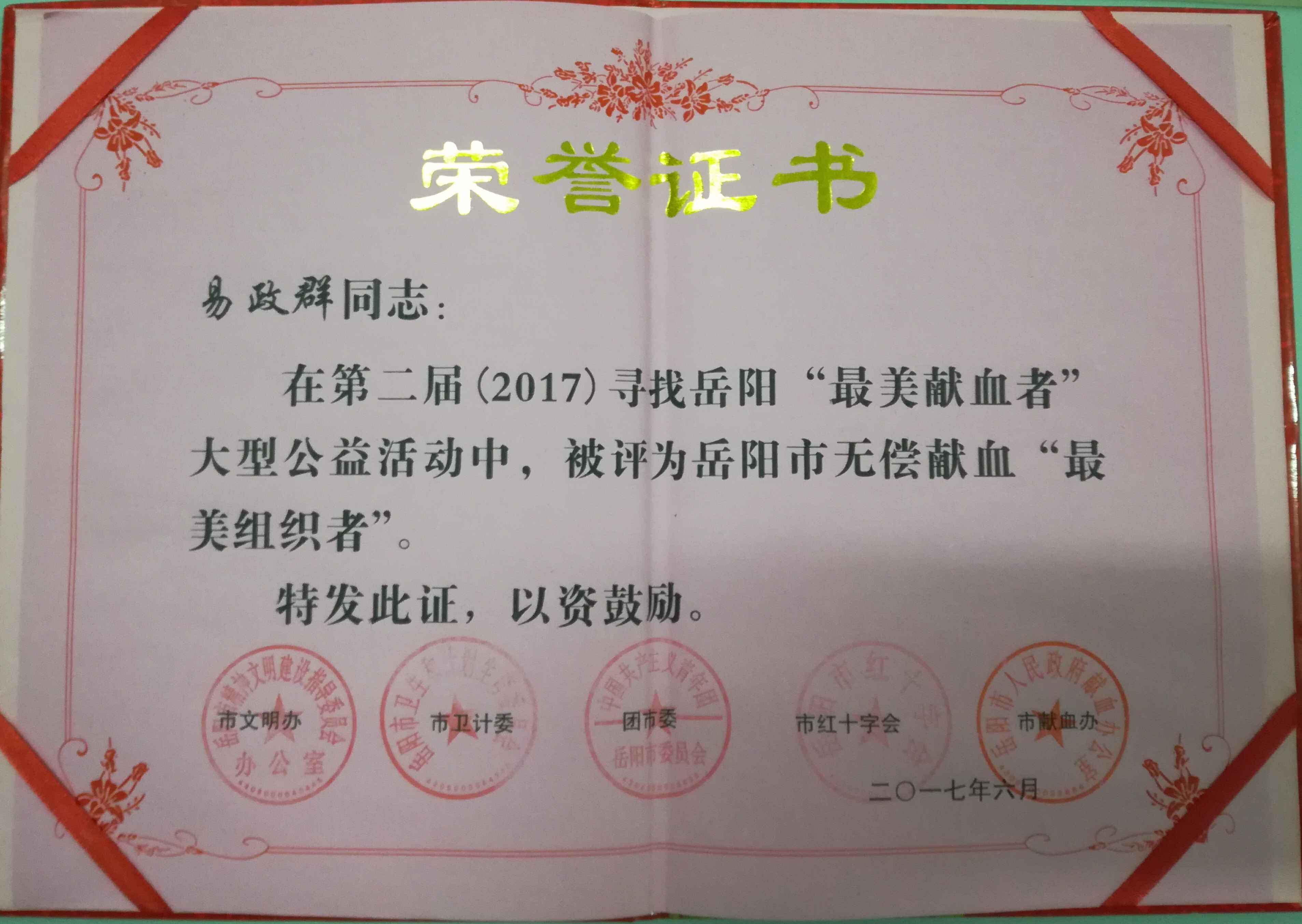 本站讯 6月11日上午,岳阳市“庆‘6.14’世界献血者日暨第二届寻找岳阳‘最美献血者’大型公益活动”,在市文化会展中心隆重举行。数学学院荣获岳阳市无偿献血“优秀团队”称号,数学学院党总支副书记易政群荣获岳阳市无偿献血“最美组织者”称号。