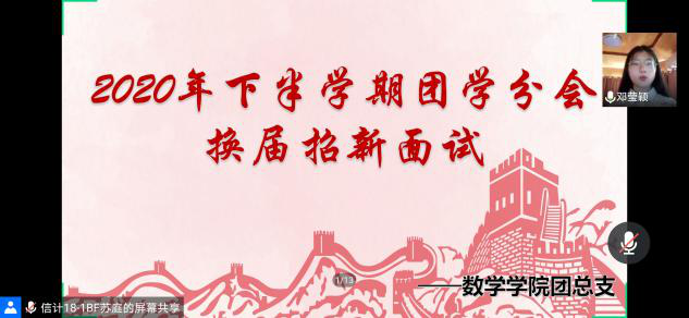 本站讯 5为了进一步整合学生组织资源,有利于更好的开展学生组织的各项工作,实现团学分会干部的新老交替,因疫情原因,数学学院在线上开展了新一届团学分会换届。本次换届会议由数学学院各学生干部评委以及所有竞选人参加。