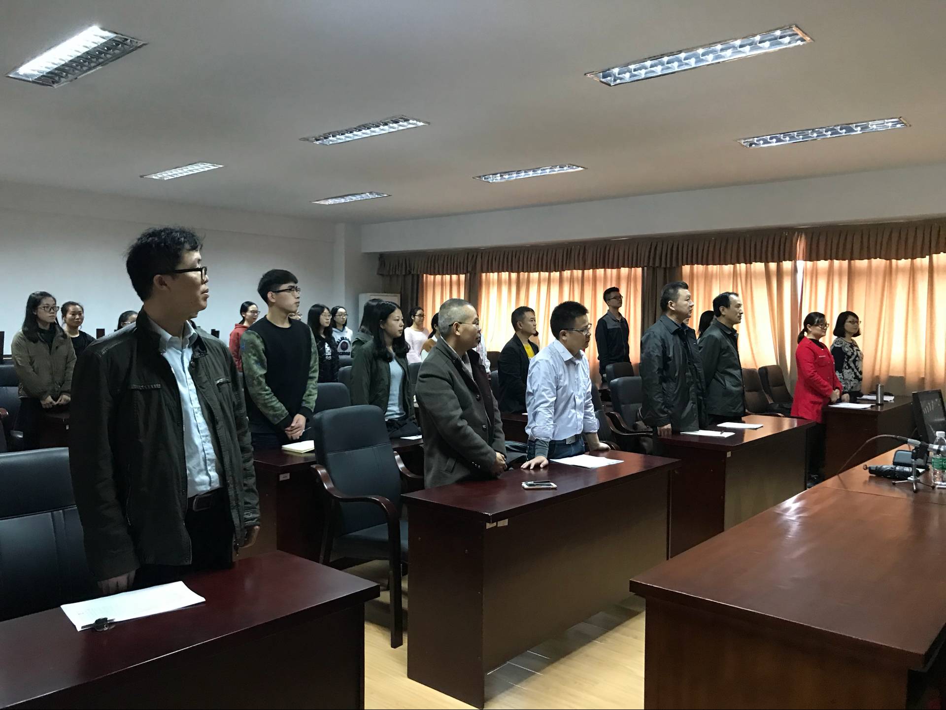 数院老师和党员学生在5511观看开幕式。“起来~不愿做奴隶的人们......”当国歌奏响时,全体师生自觉起立,向国歌致敬。