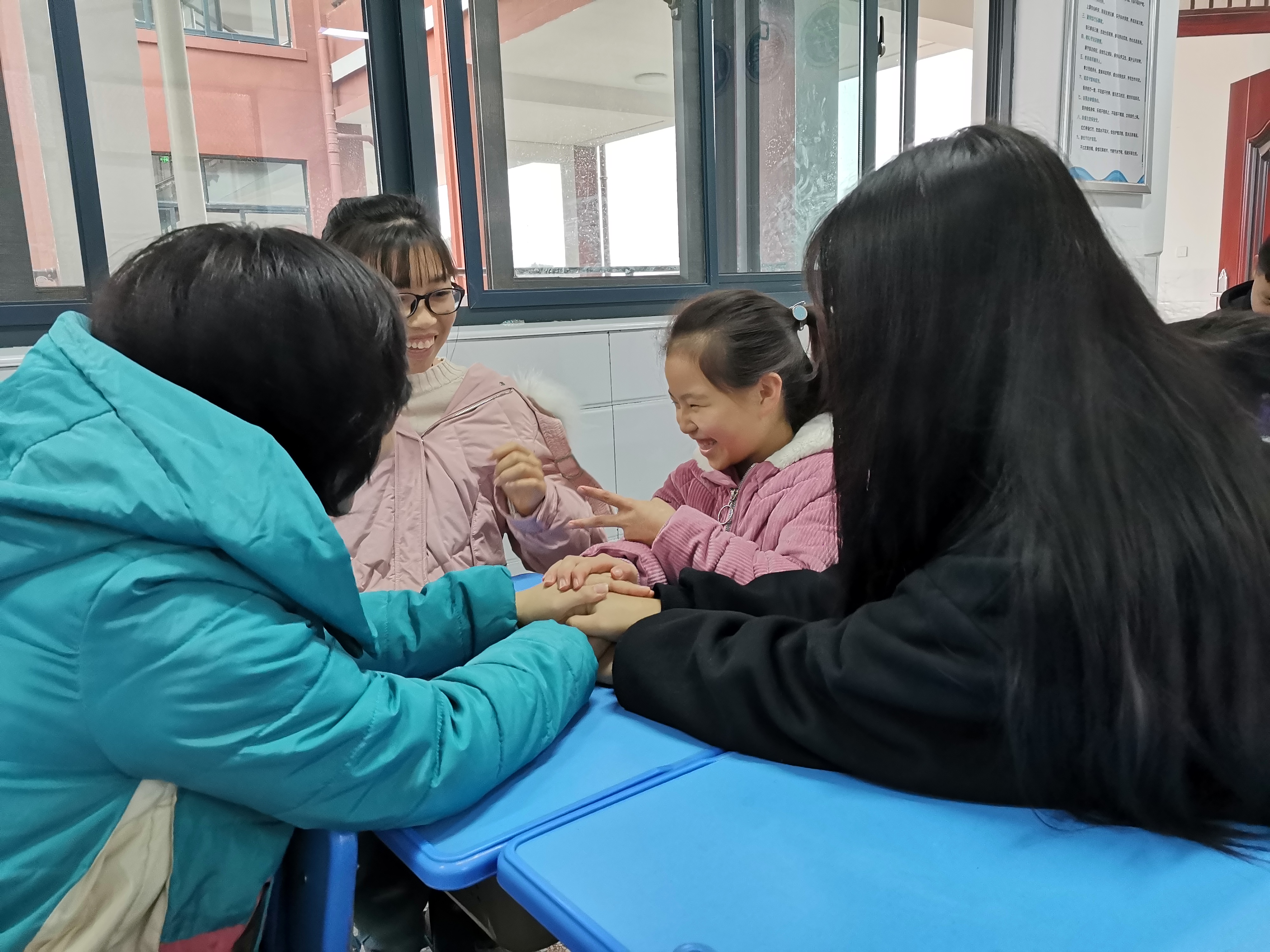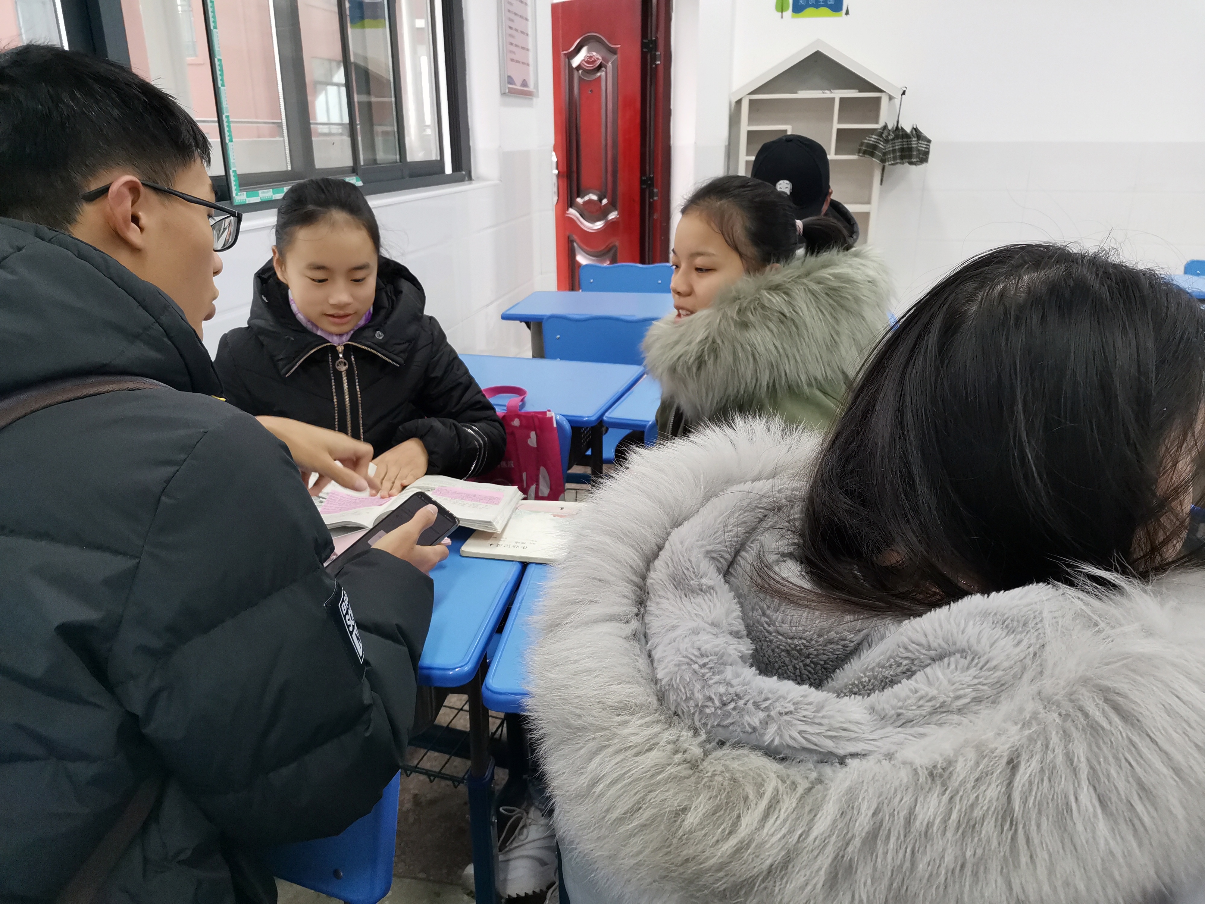 进入深冬,志愿者们依然按时来到学校后门集合,有序来到畔湖湾小学,在找到自己的配对的小朋友后,迅速进入状态。通过一个学期的接触,志愿者与小朋友已经相处得非常融洽。小朋友认真做作业和习题,志愿者在一旁指导和讲解,形成了一种浓厚的学习氛围。除此之外,志愿者还与小朋友一起画画、一起做手工、一起玩小游戏,笑声充满整个校园。